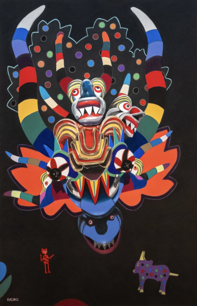 The “Bolivianos” series of pastel-on-sandpaper paintings is the latest evolution of my fascination with traditional masks. In 2017, I was inspired by an exhibition at the National Museum of Ethnography and Folklore in La Paz, Bolivia, featuring fifty Bolivian Carnival festival masks. These masks resonated with my “Black Paintings” series from the previous decade. Each mask was meticulously installed against a dark wall and spotlighted, creating an uncanny effect that sparked new inspiration in my work.